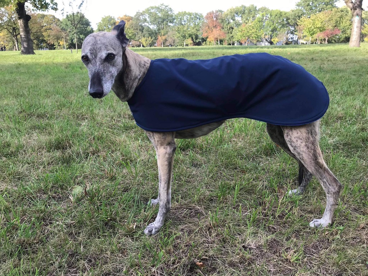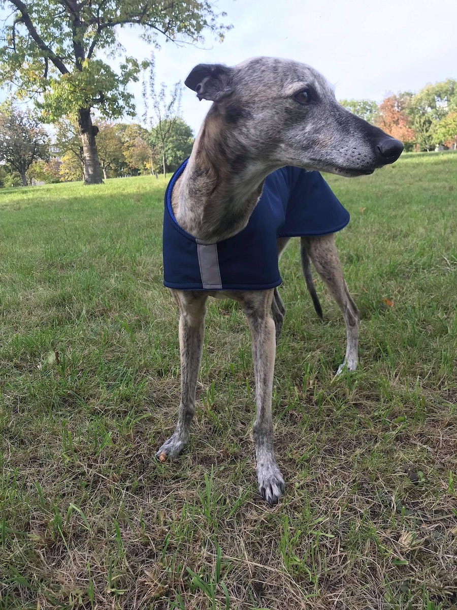 Nepromokavý hřejivý kabátek ve sportovním provedení vhodný do chladného počasí. Bunda je z jedné strany ozdobena saténovou etiketou s chrtem, v předu a na bočním zapínáním opatřena reflexním páskem. Bundička perfektně kryje celá záda a stehna psa a perfektně se přizpůsobí pohybu psa. Přední část bundy je upravena k co největšímu pohybu psa (běhání, skákání) a zapínání na břišní části upraveno tak, aby nebylo znečištěno při vykonávání potřeby (ocení zejména majitelé psů).