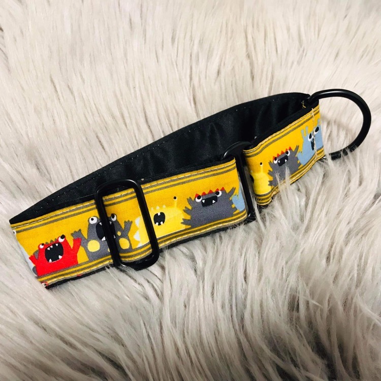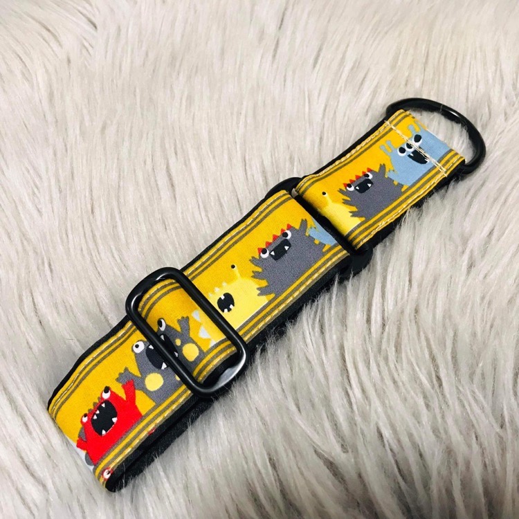 Veselý žlutý obojek s černým kováním, který ozdobí každý jemný psí krček. Vtipný motiv MONSTERS je vhodný jak pro psí pány tak i dámy.