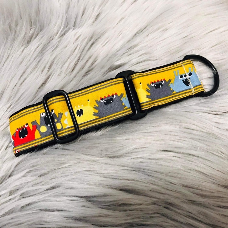 Veselý žlutý obojek s černým kováním, který ozdobí každý jemný psí krček. Vtipný motiv MONSTERS je vhodný jak pro psí pány tak i dámy.