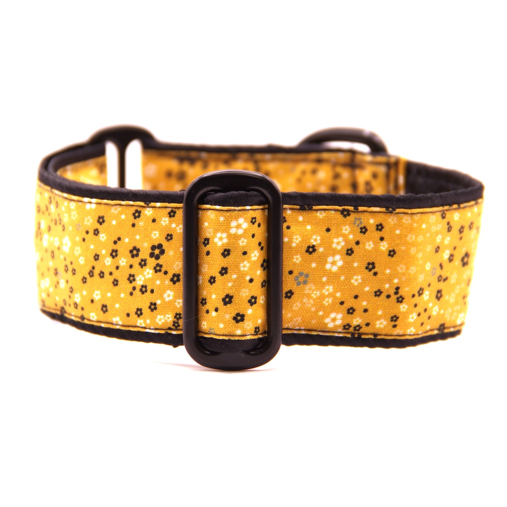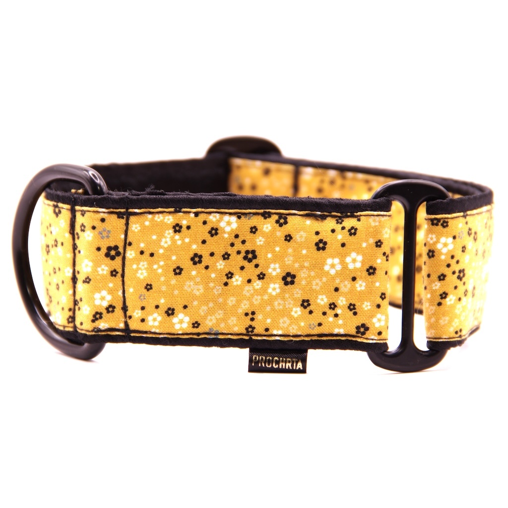 Bavlněný obojek v hořčičné barvě s jemným květinovým vzorem, doplněný kováním v černém barvě.