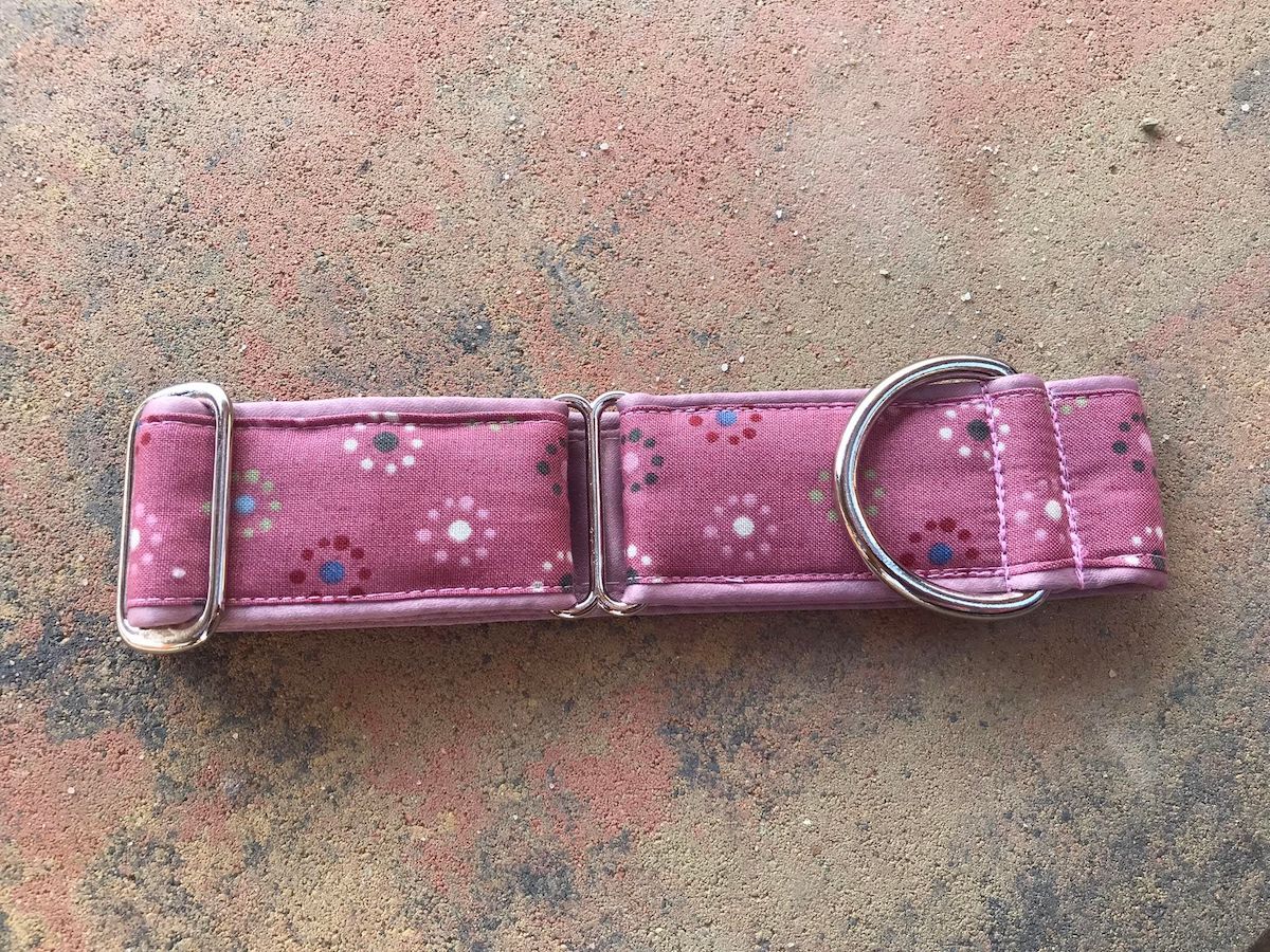 Bavlněný obojek v růžové barvě s kytičkami a se stříbrným kováním, vhodný pro psí dámy.