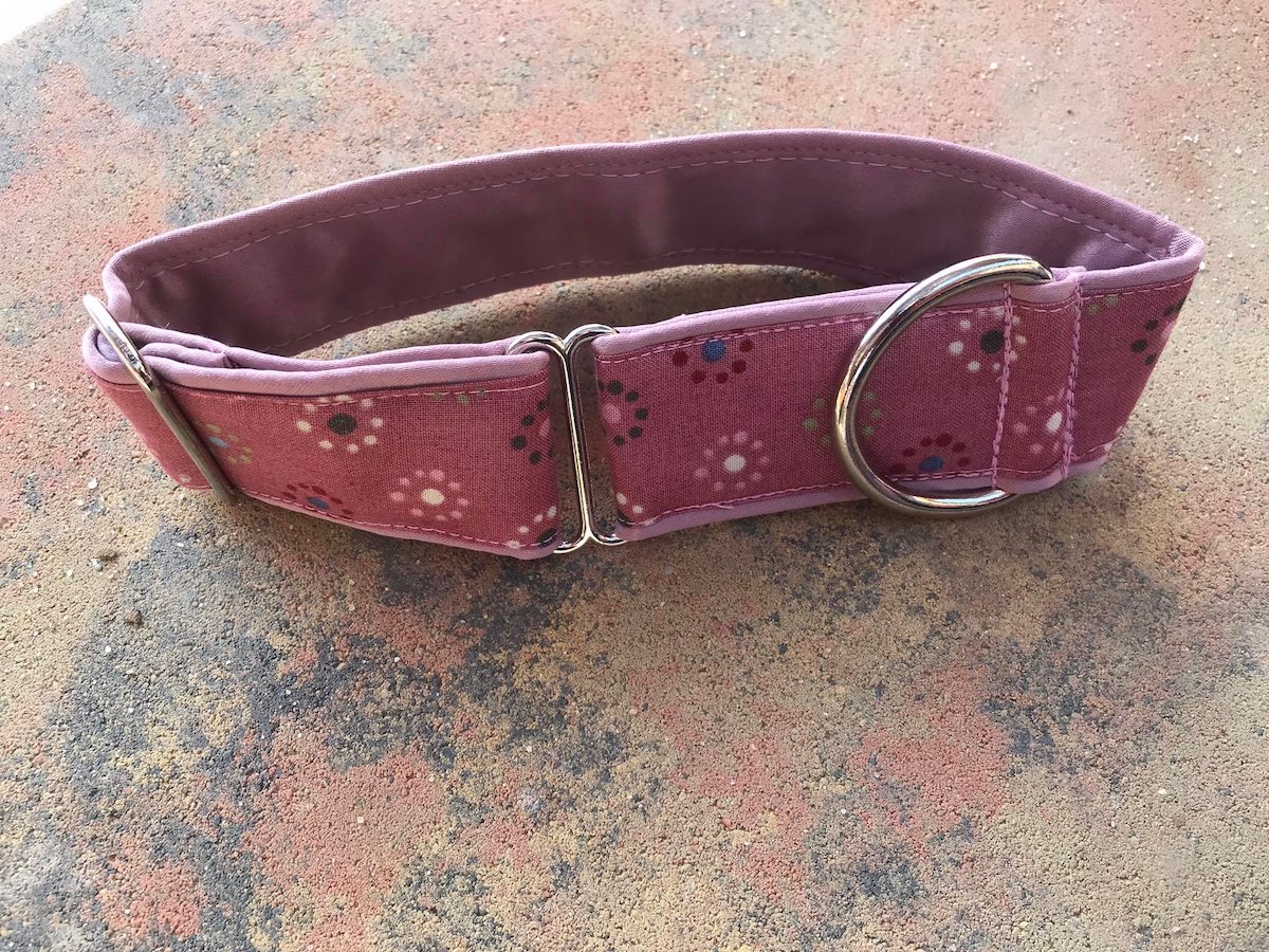 Bavlněný obojek v růžové barvě s kytičkami a se stříbrným kováním, vhodný pro psí dámy.