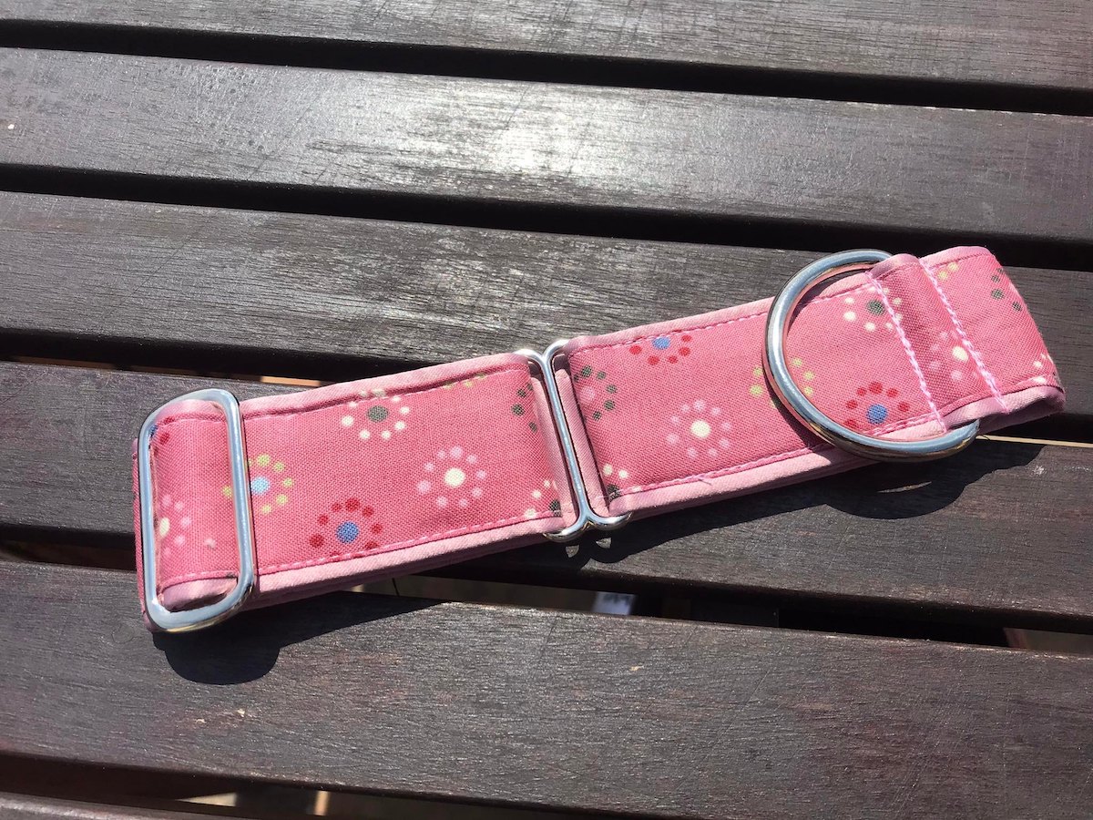 Bavlněný obojek v růžové barvě s kytičkami a se stříbrným kováním, vhodný pro psí dámy.