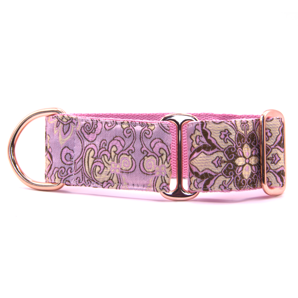 Luxusní brokátový obojek v růžové barvě s potiskem květů doplněný kováním v barvě růžového zlata.