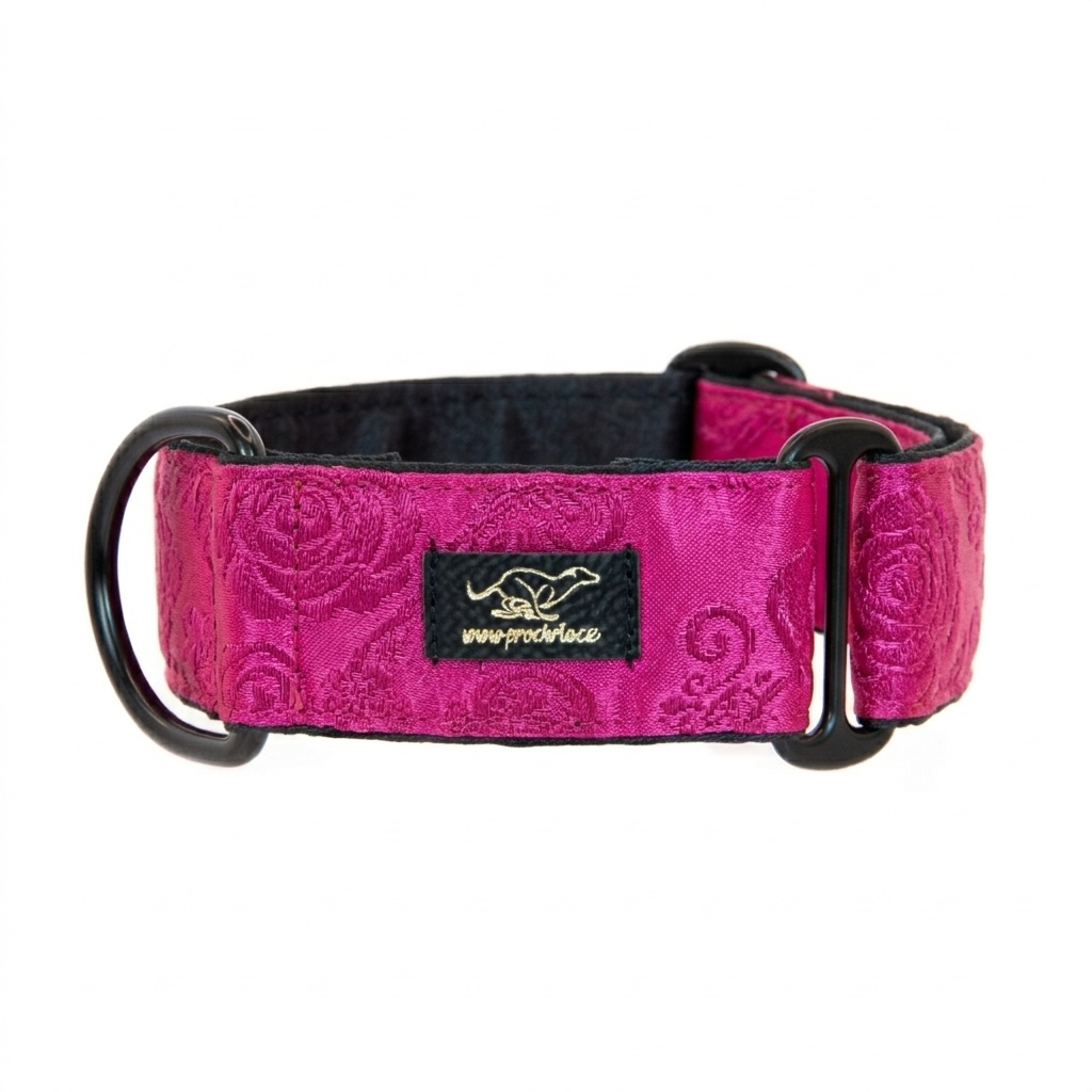 Luxusní brokátový obojek FUCHSIA ve fuchsiovo černé barvě s matně černým kováním. Elegantní vínový design s výraznějším zlatým vzorem.