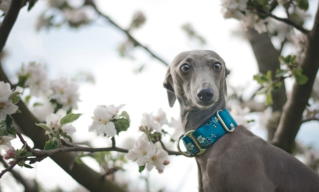 Brokátový obojek z královského brokátu s luxusním kováním v šíři 5 cm je vhodný především střední a velká plemena. Obojek je v barvě kachní modři zdobený sakurami. Obojek je podšitý saténem pro maximální komfort a celodenní nošení.