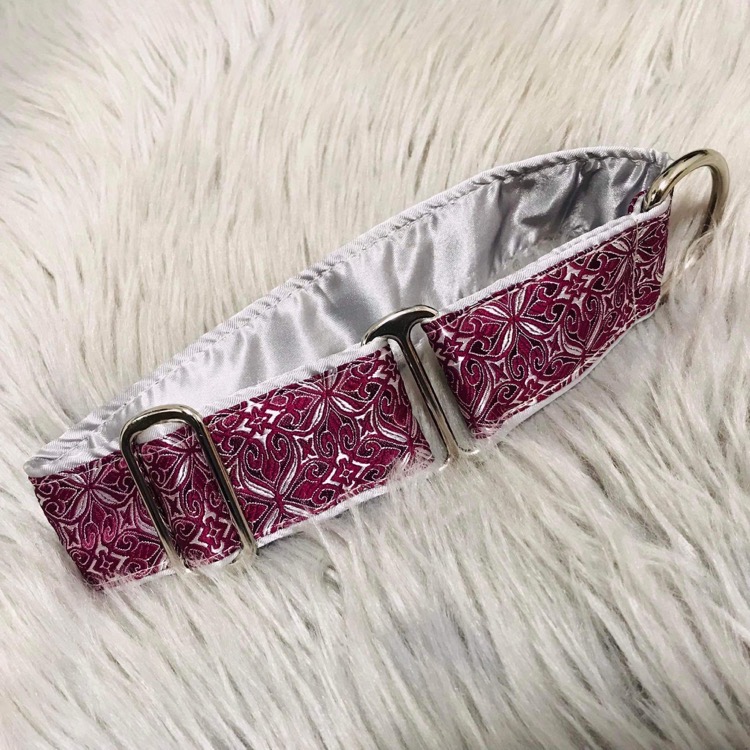 Brokátový obojek z královského brokátu ve vínové barvě s luxusním kováním v šíři 4 cm je vhodný především pro střední a větší plemena. Obojek je ušit z krásného luxusního brokátu. Obojek je podšitý saténem pro maximální komfort a celodenní nošení.