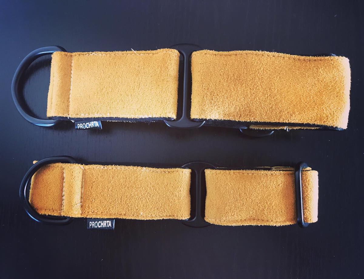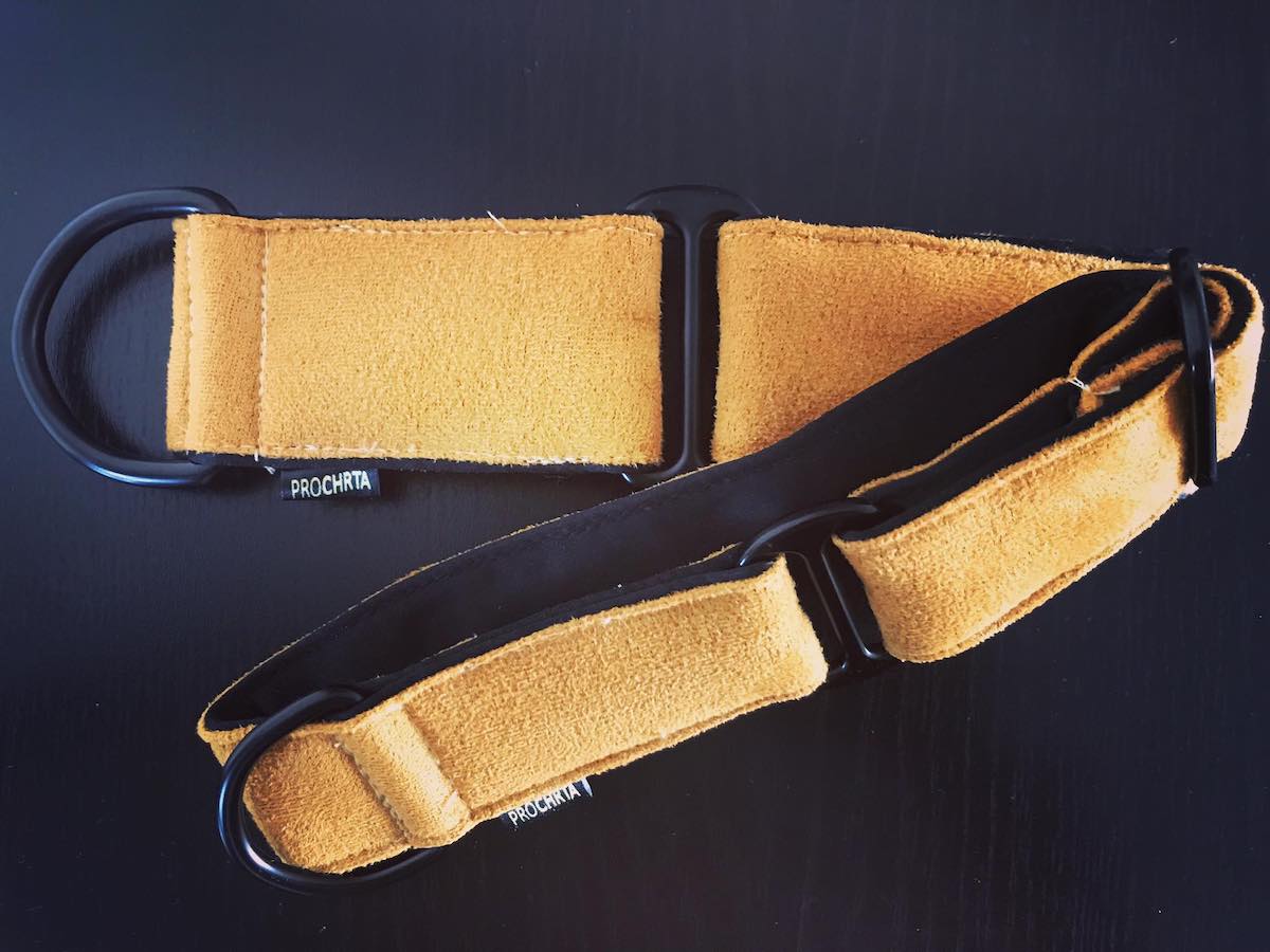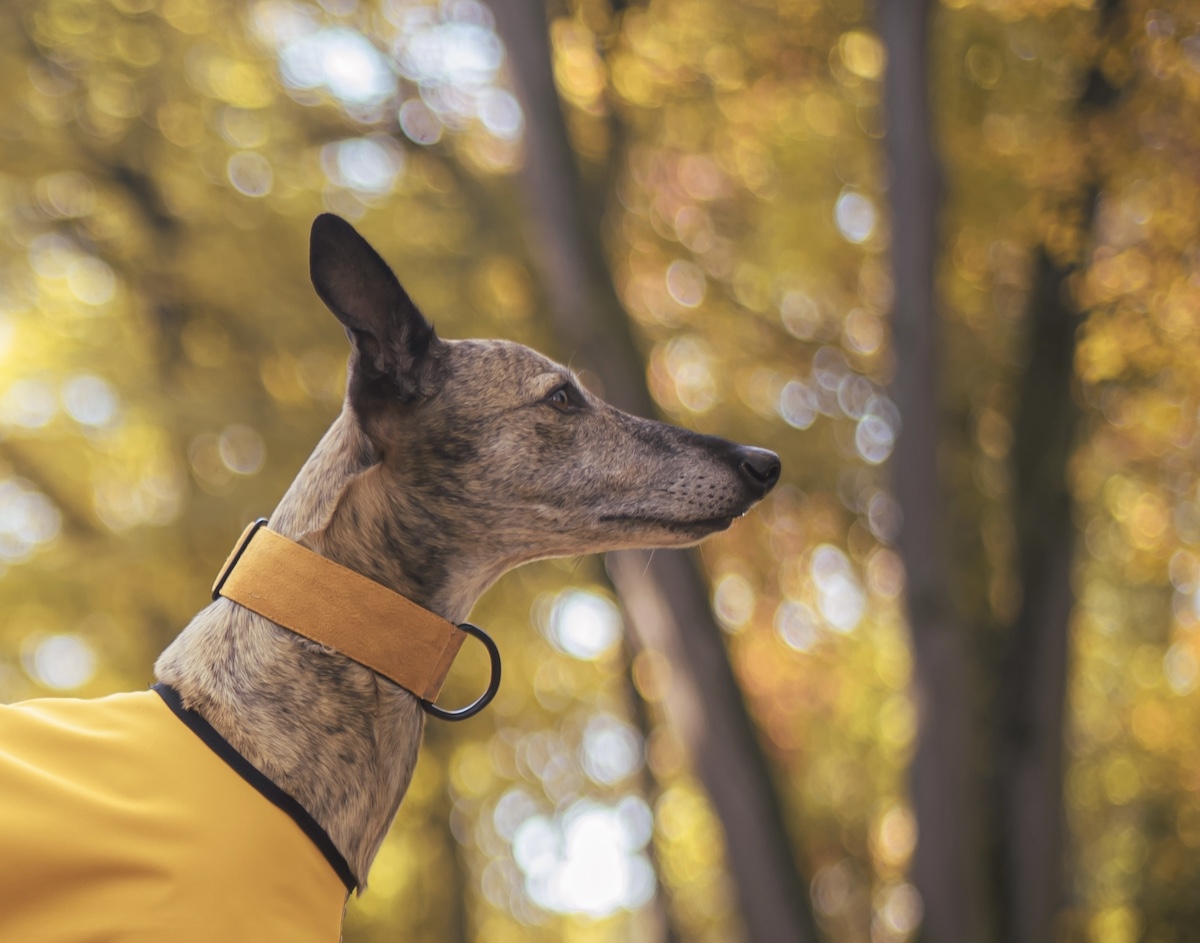 Obojek ve vzhledu semiše v hořčičné barvě s luxusním černým kováním a siluetou běžícího chrta, podšitý černým saténem pro maximální komfort.