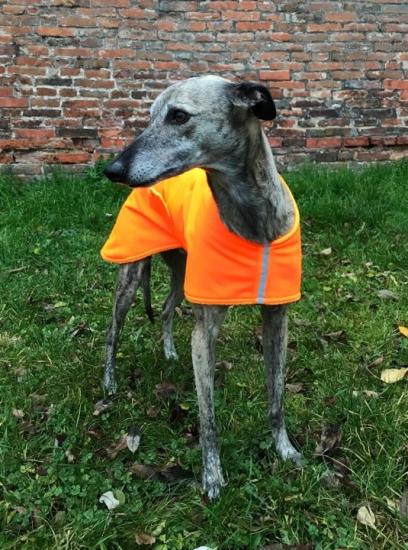 Nepromokavá hřejivá bunda ve sportovním provedení v neonové barvě pro snadnou viditelnost psa v nepříznivém počasí, členitém terénu či podzimním období, kdy je brzy tma. Bunda je z jedné strany ozdobena saténovou etiketou s chrtem a vpředu opatřena reflexním páskem. Bundička perfektně kryje celá záda a stehna psa a perfektně se přizpůsobí pohybu psa. Přední část bundy je upravena k co největšímu pohybu psa (běhání, skákání) a zapínání na břišní části upraveno tak, aby nebylo znečištěno při vykonávání potřeby (ocení zejména majitelé psů).