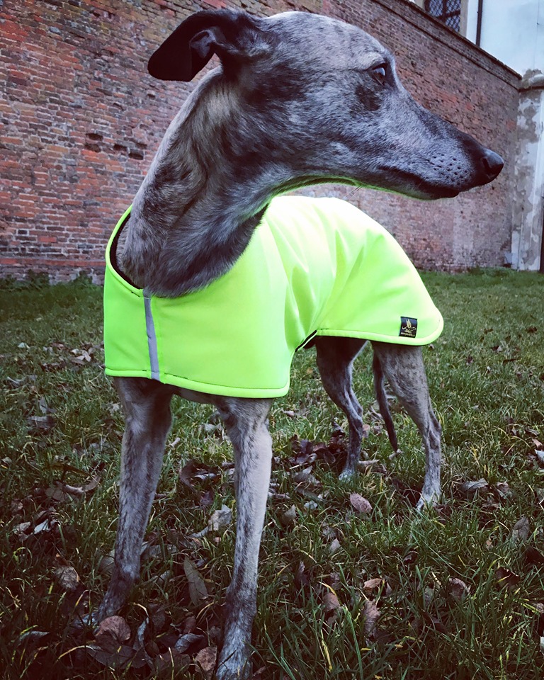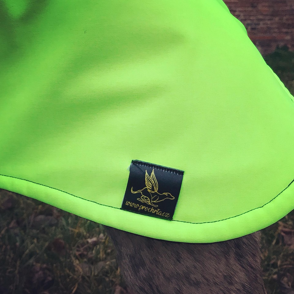 Nepromokavá hřejivá bunda ve sportovním provedení v neonové barvě pro snadnou viditelnost psa v nepříznivém počasí, členitém terénu či podzimním období, kdy je brzy tma. Bunda je z jedné strany ozdobena saténovou etiketou s chrtem a vpředu opatřena reflexním páskem. Bundička perfektně kryje celá záda a stehna psa a perfektně se přizpůsobí pohybu psa. Přední část bundy je upravena k co největšímu pohybu psa (běhání, skákání) a zapínání na břišní části upraveno tak, aby nebylo znečištěno při vykonávání potřeby (ocení zejména majitelé psů).