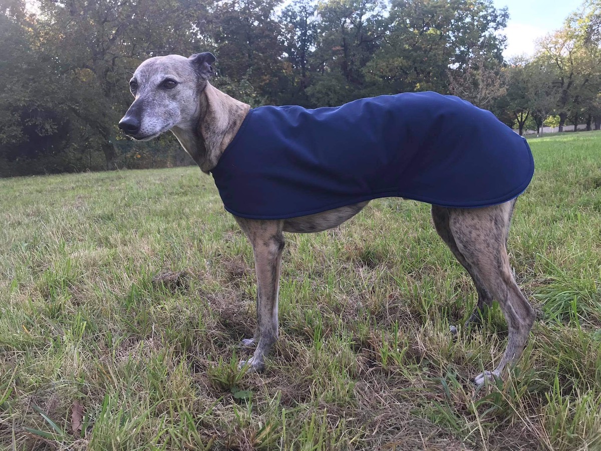Nepromokavý hřejivý kabátek ve sportovním provedení vhodný do chladného počasí. Bunda je z jedné strany ozdobena saténovou etiketou s chrtem, v předu a na bočním zapínáním opatřena reflexním páskem. Bundička perfektně kryje celá záda a stehna psa a perfektně se přizpůsobí pohybu psa. Přední část bundy je upravena k co největšímu pohybu psa (běhání, skákání) a zapínání na břišní části upraveno tak, aby nebylo znečištěno při vykonávání potřeby (ocení zejména majitelé psů).