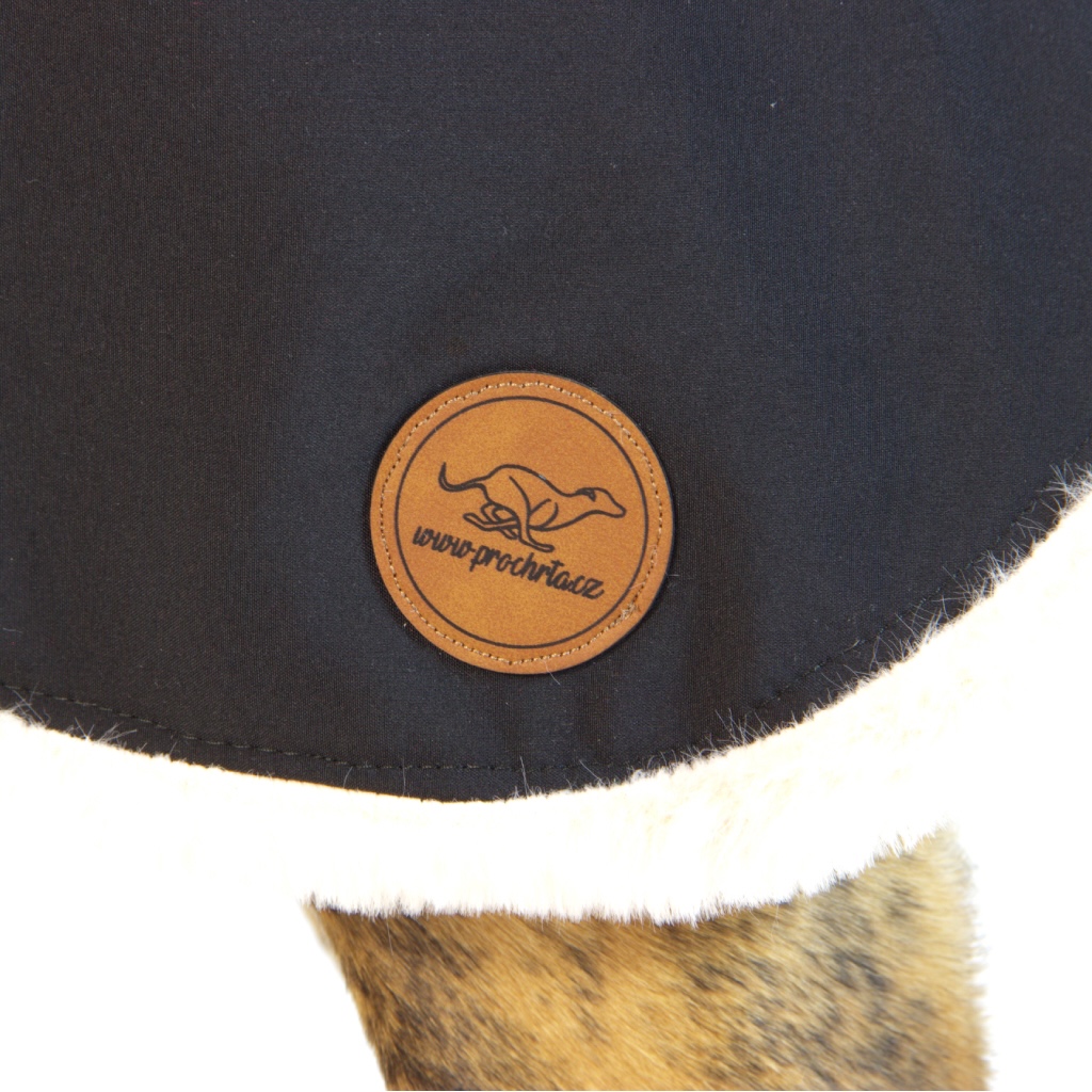 Luxusní extra teplá nepromokavá zimní bunda v černo béžové barvě doplněná elegantní koženkovou ozdobou s logem ProChrta.