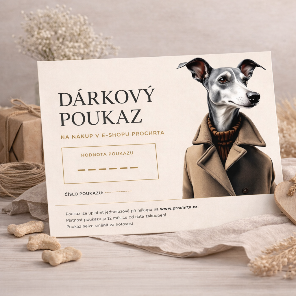 Dárkový poukaz pro chrty od ProChrta.cz je perfektní řešení – obdarovaný si vybere přesně to, co jeho chrt potřebuje.