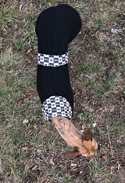 Kabátek je ušit z kvalitního nepromokavého softshell materiálu, spodní vrstva je tvořena teplým a měkkým fleecem. Stojáček a pásek je ozdoben softshell materiálem s autorským potiskem chrtů z dílny ProChrta.cz a může být nošen ohrnutý či může chránit krk. Kabátek je opatřen průstřihem na připevnění vodítka k obojku psu.