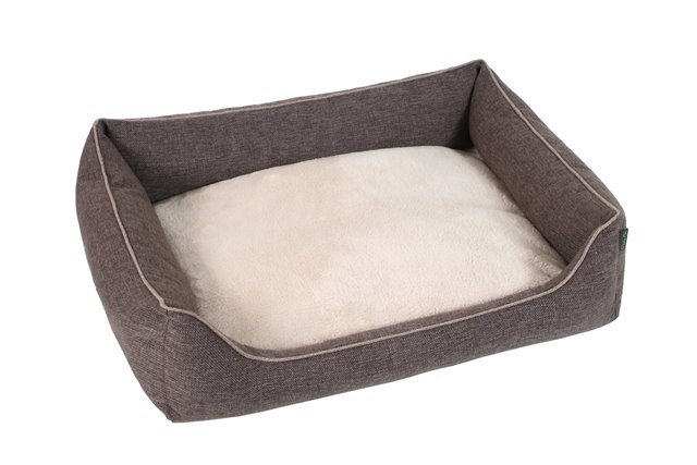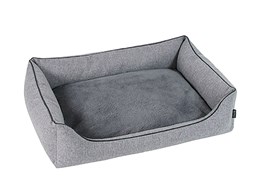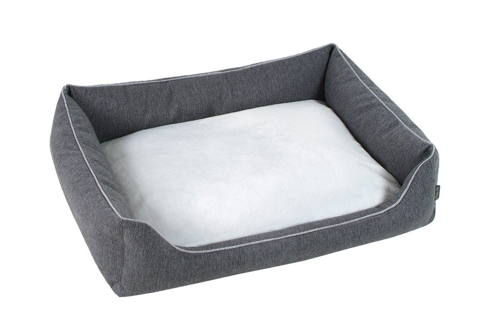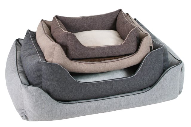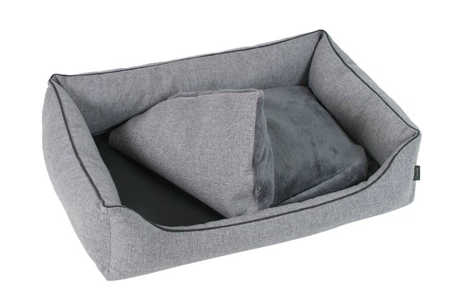 Luxusní obdélníkový pelíšek z kvalitního čalounického materiálu, dno – materiál s PVC zátěrem. Polštářek je oboustranný - čalounický materiál z jedné a měkký fleece z druhé strany.