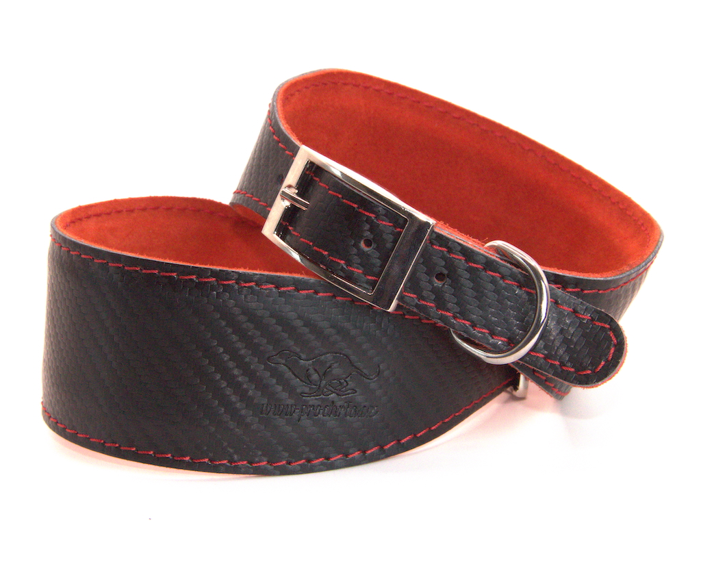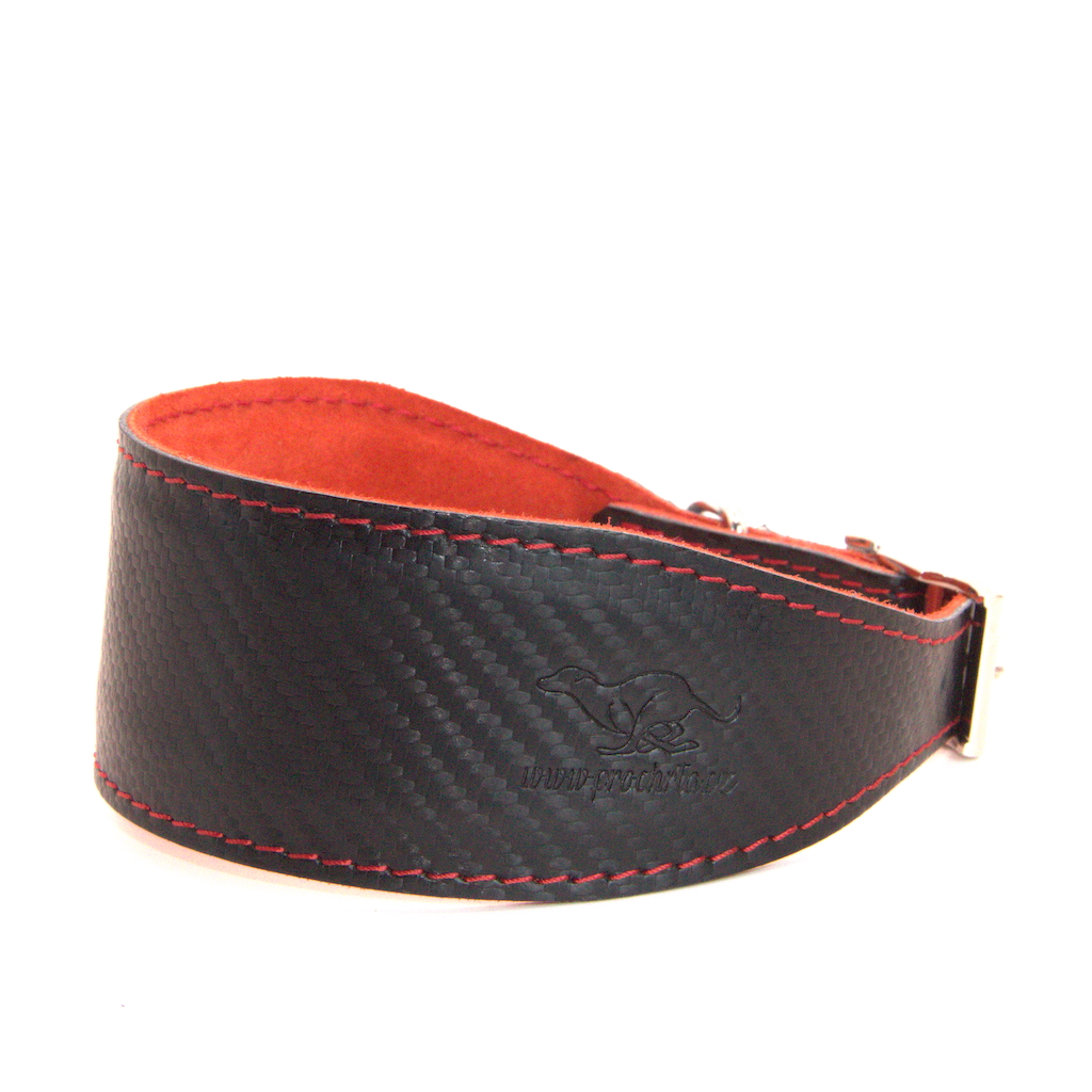 Horní kůže je v barvě ČERNÝ CARBON a spodní strana obojku a prošití obojku je v kontrastní červené barvě.