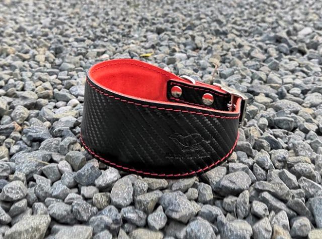 Horní kůže je v barvě ČERNÝ CARBON s kontrastním červeným prošitím a spodní strana obojku je v červené barvě.