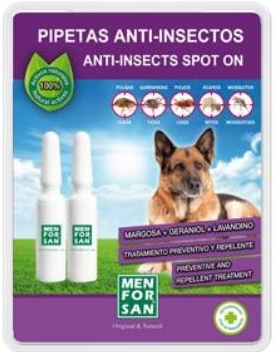 Antiparazitní pipety Menforsan pro psy (4 kusy) poskytují díky výtažkům z konopí, citronu a pelargonií perfektní ochranu proti roztočům, blechám, klíšťatům a létajícímu hmyzu. Složení pipet je čistě přírodní, takže jejich použití je možné u březích fen, štěňat a psů s alergií na běžné insekticidy.