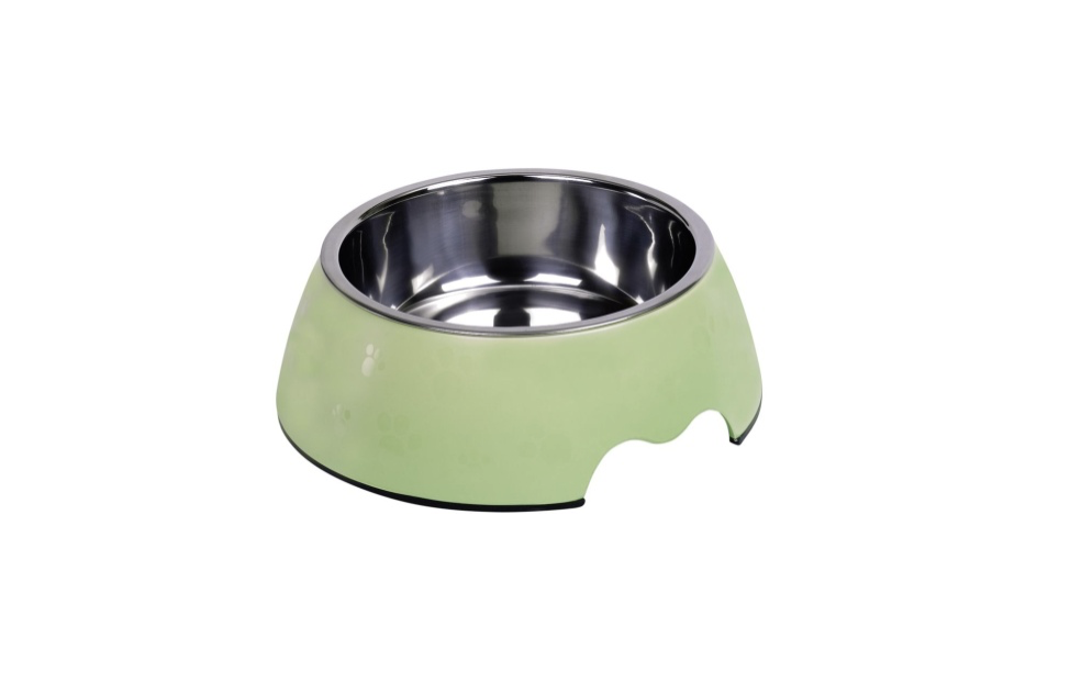 Nerezová miska o objemu 160 ml vložená do pevné průhledné misky z plastu. Pouzdro je pevné, robustní, odolné vůči nárazům a poškrábání. Protiskluzový odnímatelný kroužek na spodní straně misky. Lze mýt v myčce.