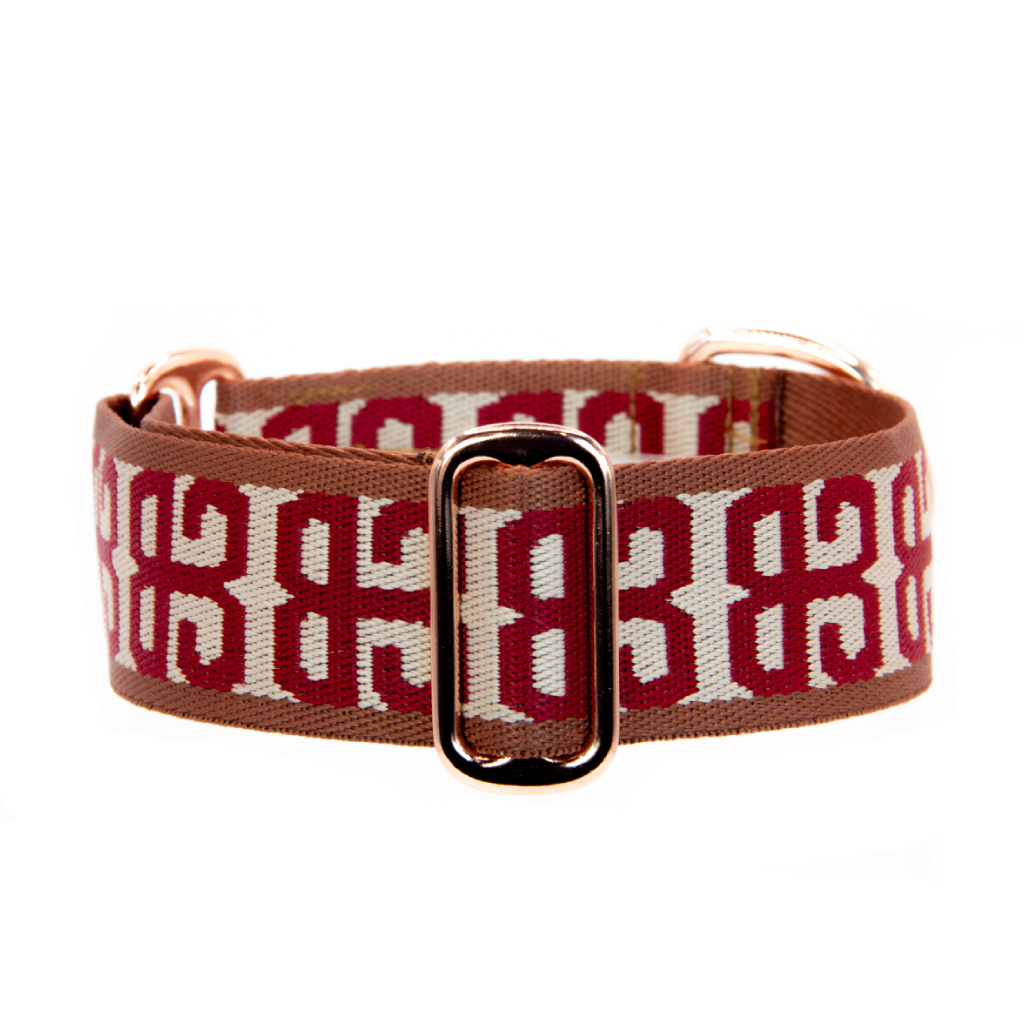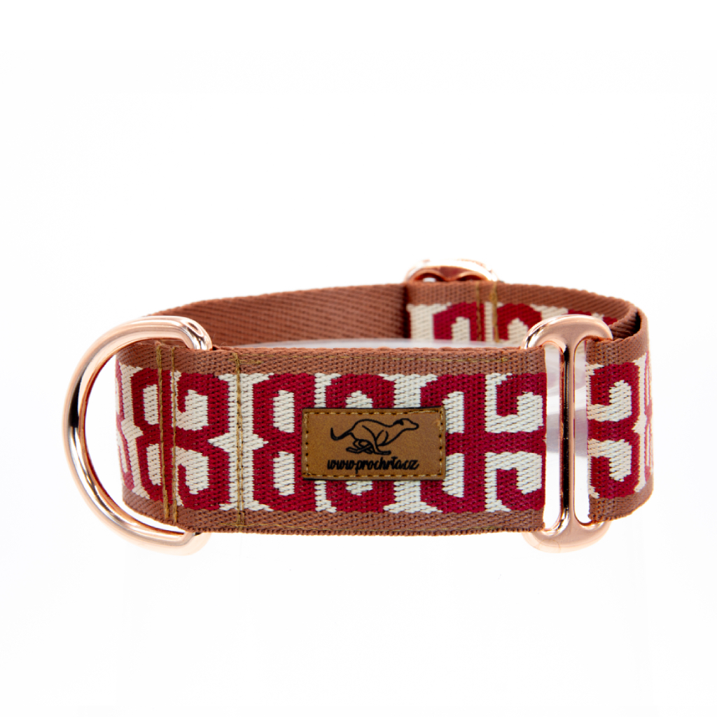 Lesklý nylonový obojek v kombinaci vínové barvy s antickým vzorem doplněný kováním v barvě růžového zlata, který dodává obojku výjimečný a luxusní vzhled. Obojek je v základu nestahovací a polohovací a velmi jednoduše se navléká. Ideální obojek do základní psí výbavy a zejména pro štěňátka - roste se štěňátky, dobře se udržuje a je lehký na nošení. Materiál obojku je lehký, rychleschnoucí a jen tak se neodře ani při pořádných psích hrátkách.