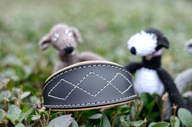 Vrchní část obojku je vyrobena z kvalitní hovězí kůže v černé barvě a spodní strana obojku a očko je z béžové jehnětiny. Obojek je prošitý béžovou sedlářskou nití a zapraven tak, aby neodíral krk.