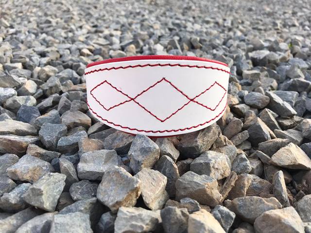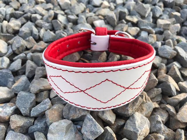 Vrchní část obojku je vyrobena z kvalitní hovězí kůže v bílé barvě a spodní strana obojku a očko je z červené jehnětiny. Obojek je prošitý červenou sedlářskou nití a zapraven tak, aby neodíral krk.