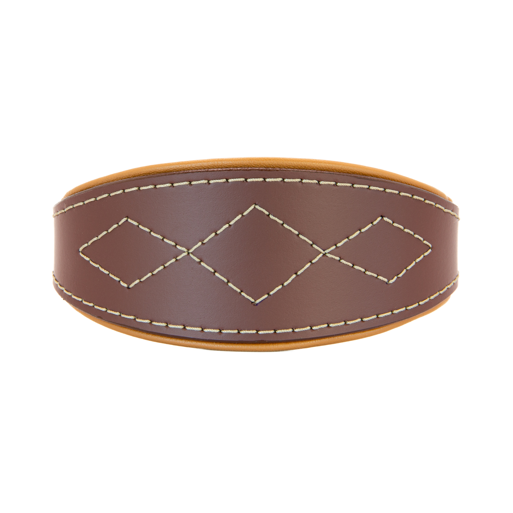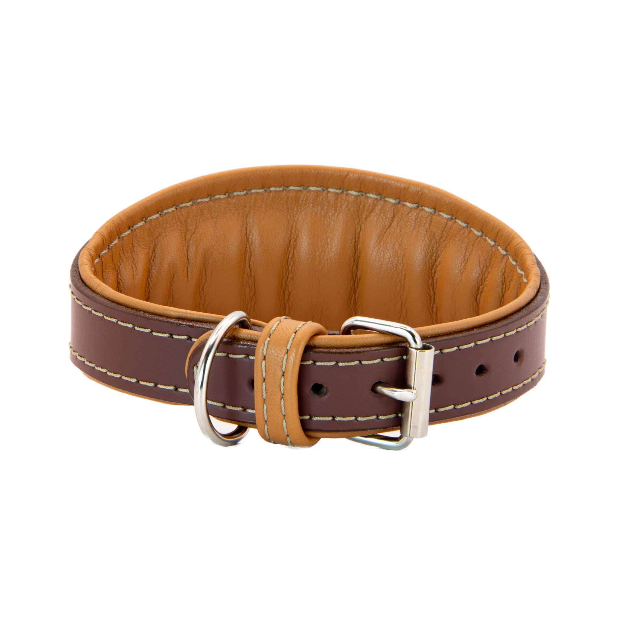Vrchní část obojku je vyrobena z kvalitní hovězí kůže v hnědé barvě. Spodní strana a očko jsou z jemné béžové jehnětiny, která je příjemná na dotek a šetrná ke srsti. Obojek je prošitý pevnou sedlářskou nití a pečlivě zapravený tak, aby nedocházelo k odírání ani při dlouhodobém nošení.