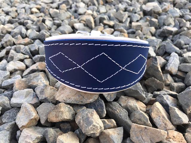 Vrchní část obojku je vyrobena z kvalitní hovězí kůže v modré barvě a spodní strana obojku a očko je z bílé jehnětiny. Obojek je prošitý bílou sedlářskou nití a zapraven tak, aby neodíral krk.