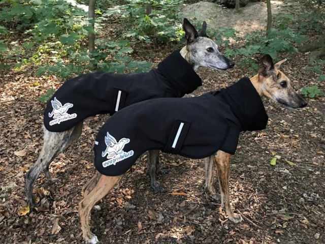 Nepromokavá hřejivá bunda a pláštěnka v jednom v elegantním sportovním provedení. Bunda je z jedné strany ozdobena stříbrným chrtem a z druhé saténovou etiketou s chrtem. Zapínání je na suchý zip. Bunda má anatomické tvarování ve hřbetní a ocasní části, proto se perfektně přizpůsobí pohybu psa, aniž by se nadzvedávala zadní část bundy. Přední část bundy je upravena k co největšímu pohybu psa (běhání, skákání) a zapínání na břišní části upraveno tak, aby nebylo znečištěno při vykonávání potřeby (ocení zejména majitelé psů). Bundička má návlek na celý krk, jehož obvod je možno nastavit dle potřeby. Obleček je doplněn otvorem pro upevnění vodítka k obojku.