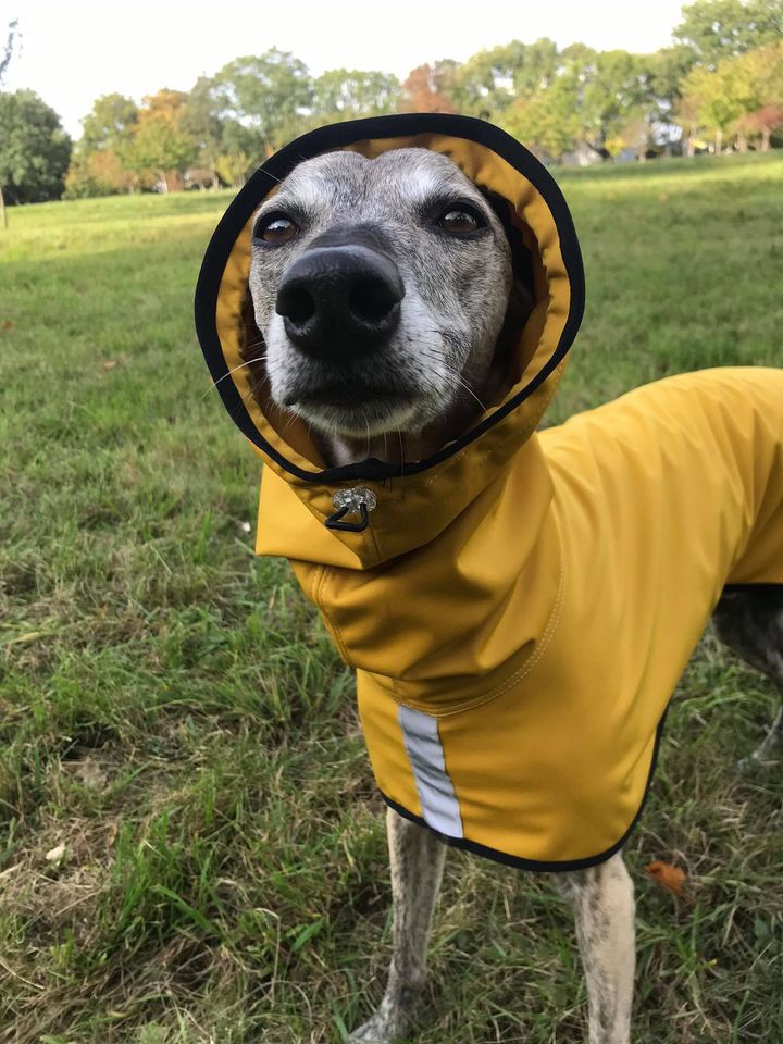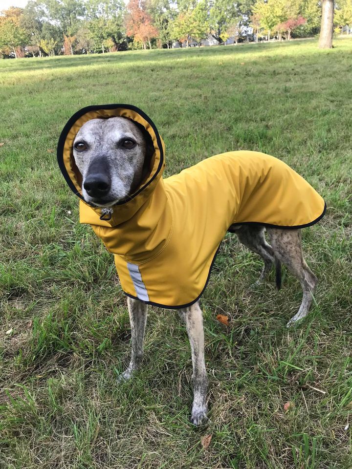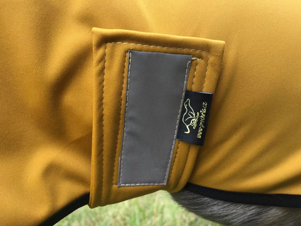 Elegantní pláštěnka z kolekce MUSTARD v hořčičné barvě s černými lemy. Pláštěnka parádně kryje všechny důležité části těla a zároveň je v ní pejsek velmi dobře viditelný a to v kombinaci s trendy barvou!