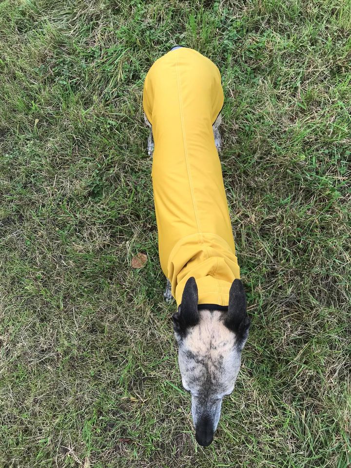 Hořčičná MUSTARD pláštěnka je lehoučká, nepromokavá a elegantní pláštěnka v jednom. Pláštěnka je obšitá černým lemem. Zapínání je na suchý zip a je upraveno tak, aby nebylo znečištěno při vykonávání potřeby (ocení hlavně majitelé psů). Pláštěnka má návlek na celý krk, jehož obvod je možno nastavit dle potřeby stahovací gumičkou s korálkem. Obleček je doplněn otvorem pro upevnění vodítka k obojku. Pláštěnka je opatřena bezpečnostními prvky v podobě odrazek, které jsou umístěny v předu na hrudi a z boku na zapínání.