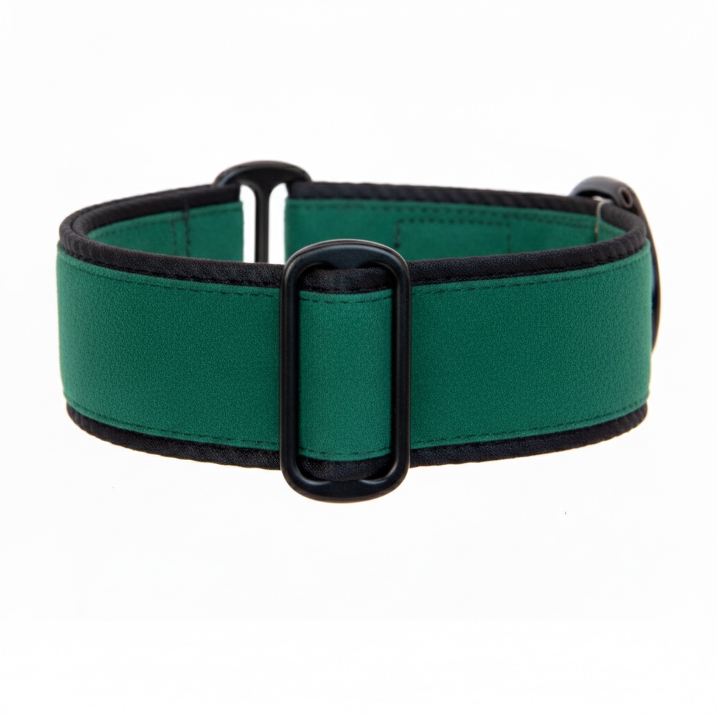 Obojek ve vzhledu semiše ve smaragdově zelené barvě s luxusním černým kováním a siluetou běžícího chrta, podšitý černým saténem pro maximální komfort.