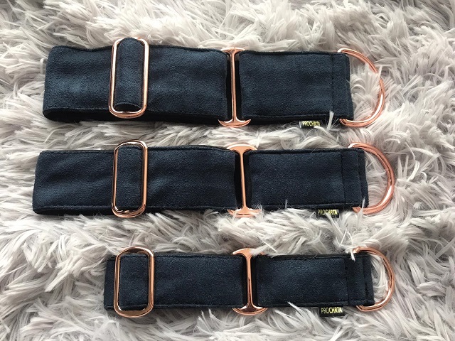 Obojek ve vzhledu semiše v tmavě modré barvě s kováním z růžového zlata a siluetou běžícího chrta, podšitý černým saténem pro maximální komfort.