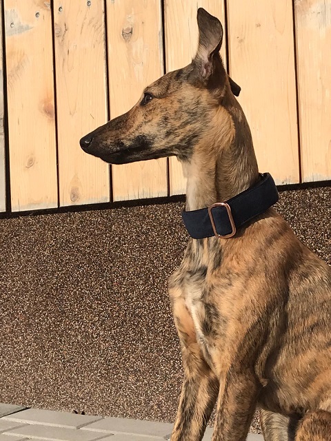 Nádherný obojek v kombinaci noční modré a růžově zlatého kování, který svým vzhledem imituje semiš a působí tak velmi ušlechtilým dojmem. Je nejen krásný, ale i praktický - nedrží se na něm totiž špína a lze snadno otřít. Na obojku je umístěna silueta běžícího chrta.