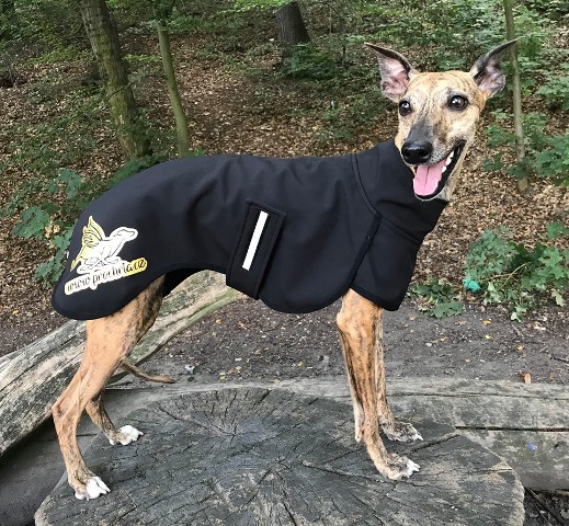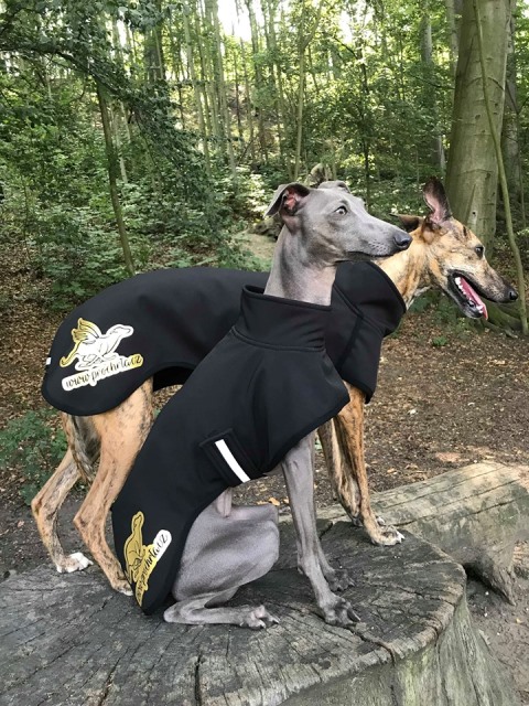Nepromokavá hřejivá bunda v elegantním sportovním provedení. Bunda je z jedné strany ozdobena zlatým chrtem a z druhé saténovou etiketou s chrtem. Zapínání je na suchý zip. Bunda má anatomické tvarování ve hřbetní a ocasní části, proto se perfektně přizpůsobí pohybu psa, aniž by se nadzvedávala zadní část bundy. Přední část bundy je upravena k co největšímu pohybu psa (běhání, skákání) a zapínání na břišní části upraveno tak, aby nebylo znečištěno při vykonávání potřeby (ocení zejména majitelé psů). Obleček je doplněn elegantním stojáčkem, který kryje krk.