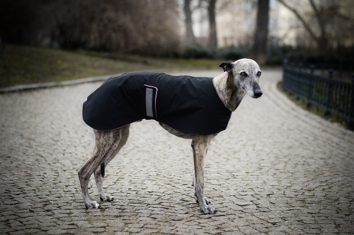 Nepromokavý hřejivý kabátek ve sportovním provedení vhodný do chladného počasí. Bunda je z jedné strany ozdobena saténovou etiketou s chrtem, v předu a na bočním zapínáním opatřena reflexním páskem. Bundička perfektně kryje celá záda a stehna psa a perfektně se přizpůsobí pohybu psa. Přední část bundy je upravena k co největšímu pohybu psa (běhání, skákání) a zapínání na břišní části upraveno tak, aby nebylo znečištěno při vykonávání potřeby (ocení zejména majitelé psů).