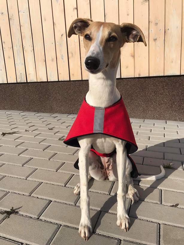 Nepromokavý hřejivý kabátek ve sportovním provedení vhodný do chladného počasí. Bunda je z jedné strany ozdobena saténovou etiketou s chrtem, v předu a na bočním zapínáním opatřena reflexním páskem. Bundička perfektně kryje celá záda a stehna psa a perfektně se přizpůsobí pohybu psa. Přední část bundy je upravena k co největšímu pohybu psa (běhání, skákání) a zapínání na břišní části upraveno tak, aby nebylo znečištěno při vykonávání potřeby (ocení zejména majitelé psů).