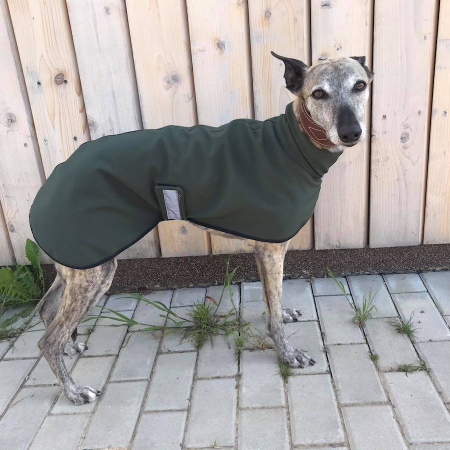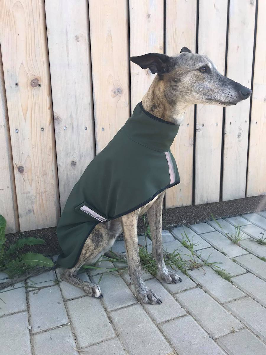 Nepromokavá hřejivá bunda v elegantním sportovním provedení. Bunda je z jedné strany ozdobena saténovou etiketou s chrtem. Zapínání je na suchý zip. Bunda má anatomické tvarování ve hřbetní a ocasní části, proto se perfektně přizpůsobí pohybu psa, aniž by se nadzvedávala zadní část bundy. Přední část bundy je upravena k co největšímu pohybu psa (běhání, skákání) a zapínání na břišní části upraveno tak, aby nebylo znečištěno při vykonávání potřeby (ocení zejména majitelé psů). Obleček je doplněn elegantním stojáčkem, který kryje krk.