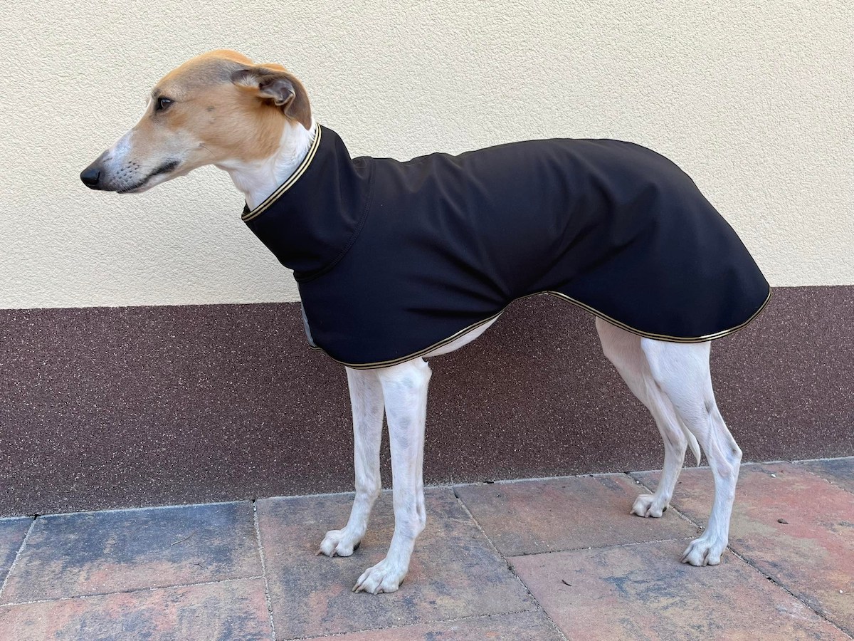 Nepromokavá hřejivá bunda v elegantním sportovním provedení. Bunda je z jedné strany ozdobena saténovou etiketou s chrtem. Zapínání je na suchý zip. Bunda má anatomické tvarování ve hřbetní a ocasní části, proto se perfektně přizpůsobí pohybu psa, aniž by se nadzvedávala zadní část bundy. Přední část bundy je upravena k co největšímu pohybu psa (běhání, skákání) a zapínání na břišní části upraveno tak, aby nebylo znečištěno při vykonávání potřeby (ocení zejména majitelé psů). Obleček je doplněn elegantním stojáčkem, který kryje krk.