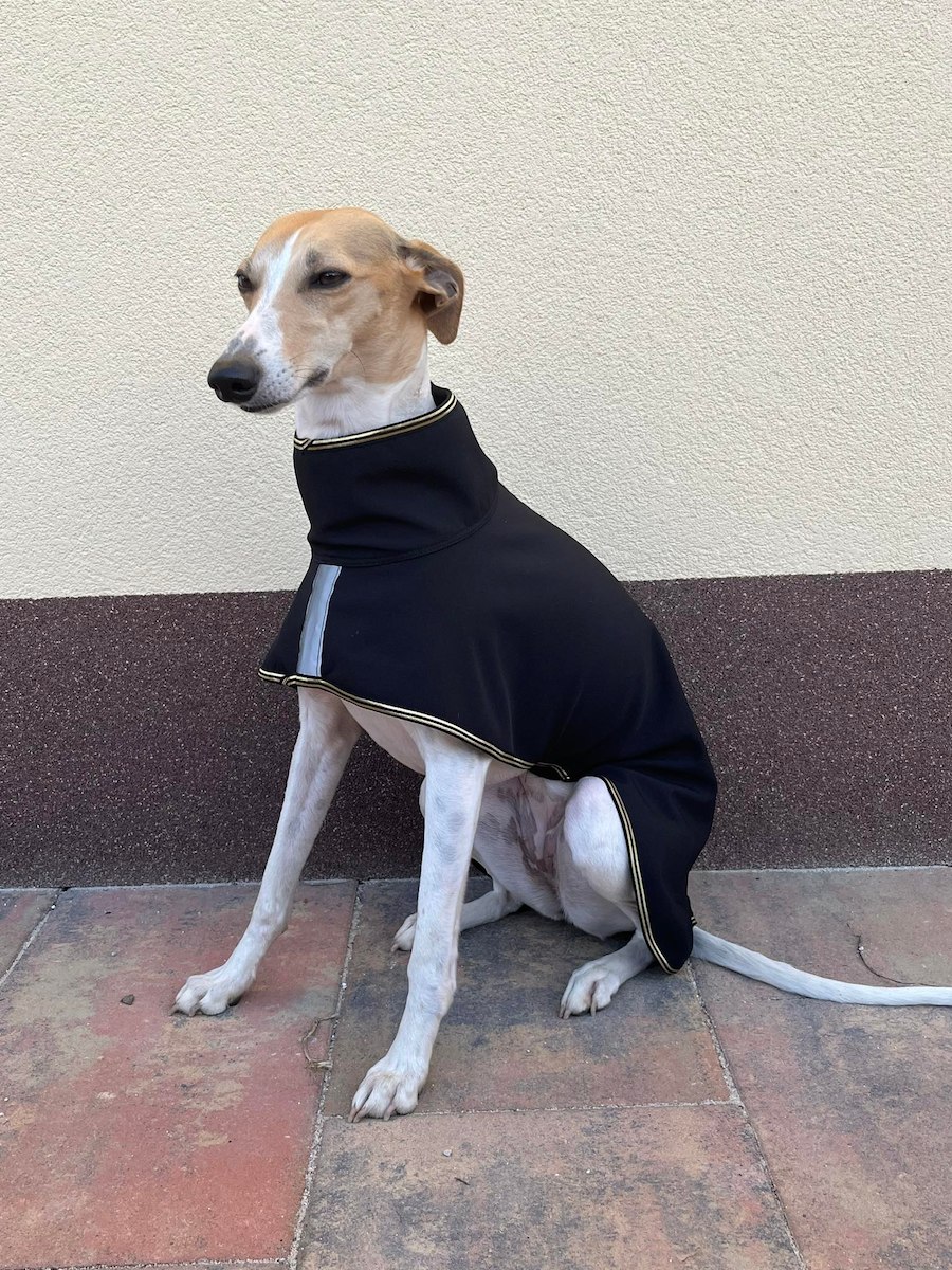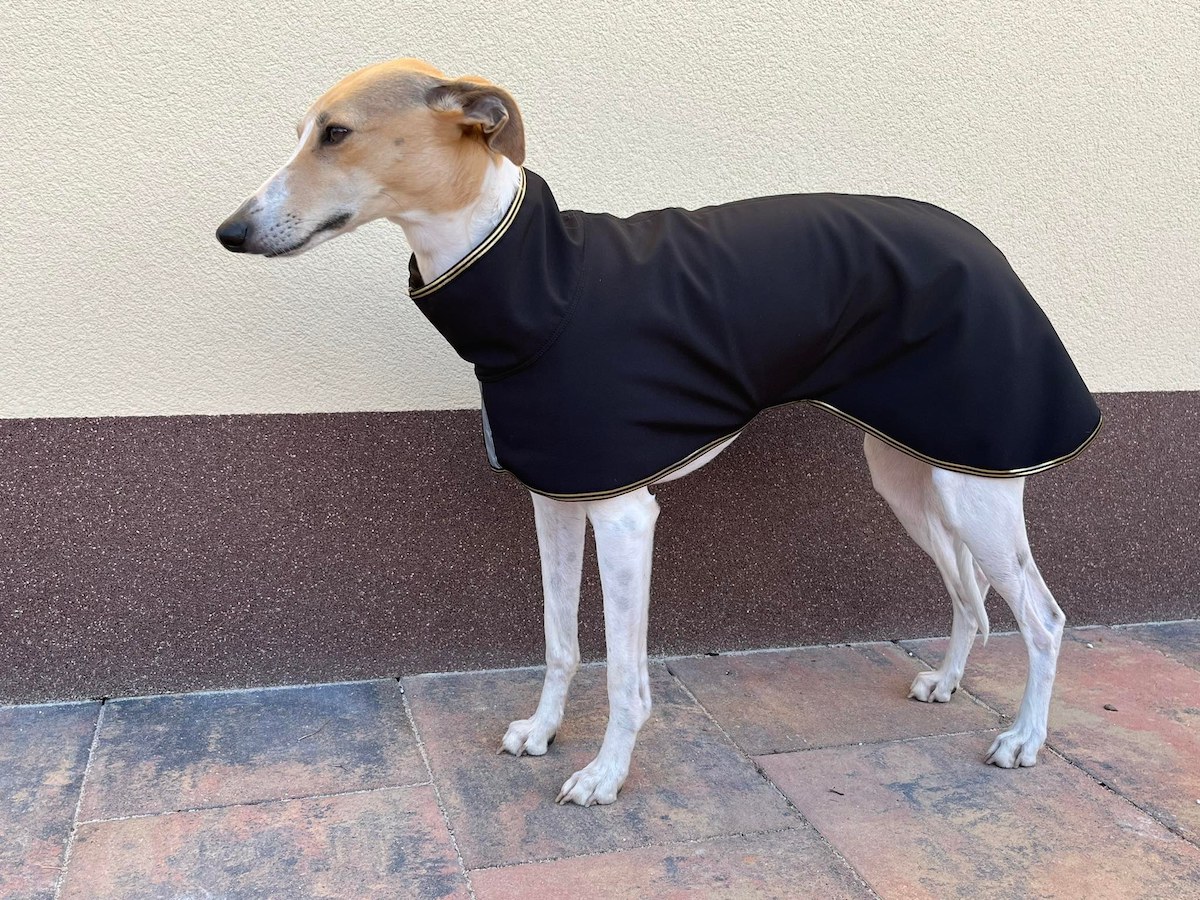 Nepromokavá hřejivá bunda v elegantním sportovním provedení. Bunda je z jedné strany ozdobena saténovou etiketou s chrtem. Zapínání je na suchý zip. Bunda má anatomické tvarování ve hřbetní a ocasní části, proto se perfektně přizpůsobí pohybu psa, aniž by se nadzvedávala zadní část bundy. Přední část bundy je upravena k co největšímu pohybu psa (běhání, skákání) a zapínání na břišní části upraveno tak, aby nebylo znečištěno při vykonávání potřeby (ocení zejména majitelé psů). Obleček je doplněn elegantním stojáčkem, který kryje krk.
