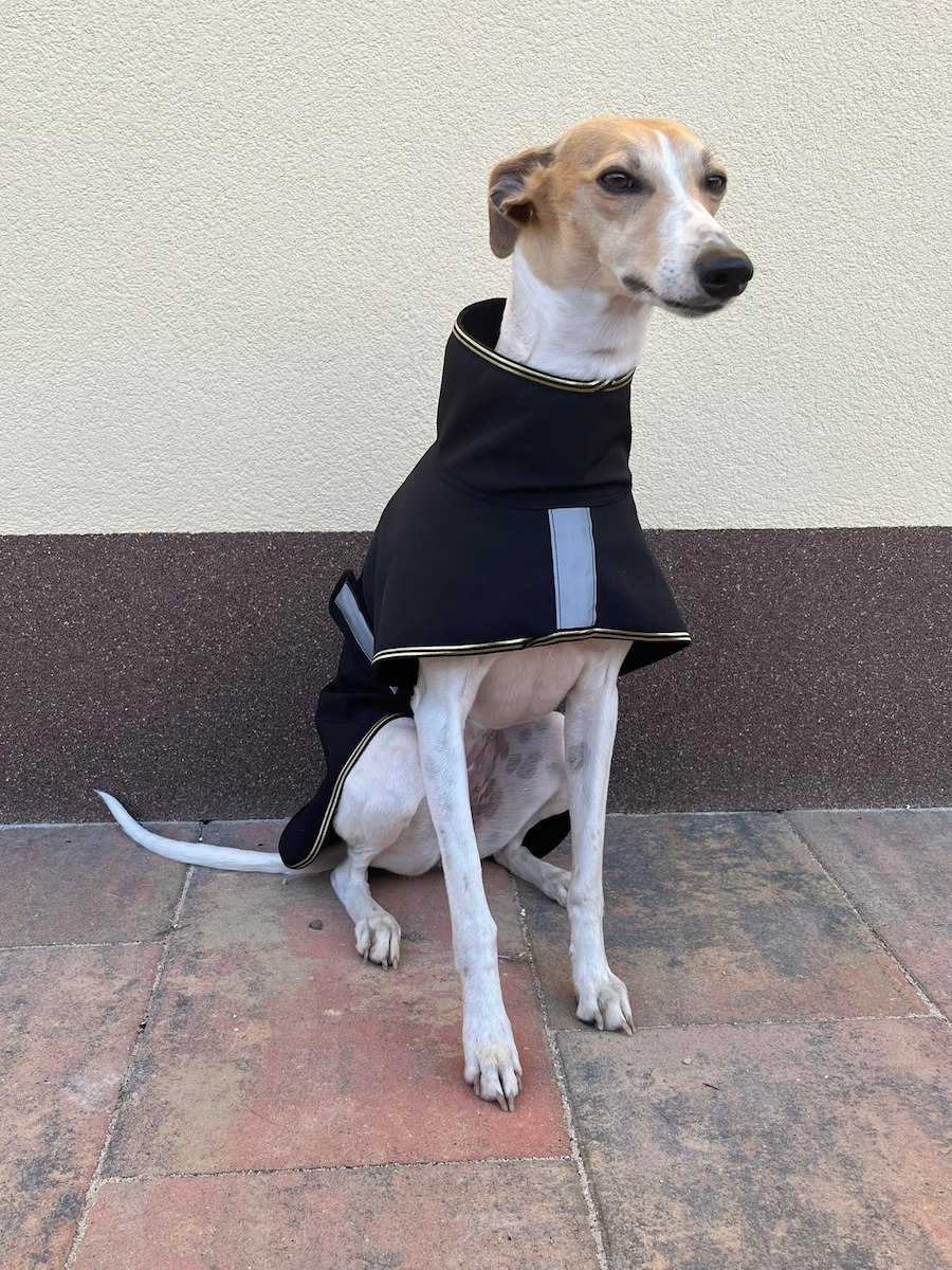 Nepromokavá hřejivá bunda v elegantním sportovním provedení. Bunda je z jedné strany ozdobena saténovou etiketou s chrtem. Zapínání je na suchý zip. Bunda má anatomické tvarování ve hřbetní a ocasní části, proto se perfektně přizpůsobí pohybu psa, aniž by se nadzvedávala zadní část bundy. Přední část bundy je upravena k co největšímu pohybu psa (běhání, skákání) a zapínání na břišní části upraveno tak, aby nebylo znečištěno při vykonávání potřeby (ocení zejména majitelé psů). Obleček je doplněn elegantním stojáčkem, který kryje krk.