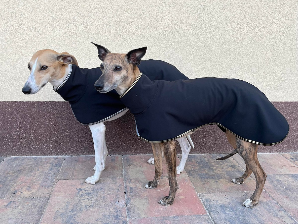 Nepromokavá hřejivá bunda v elegantním sportovním provedení. Bunda je z jedné strany ozdobena saténovou etiketou s chrtem. Zapínání je na suchý zip. Bunda má anatomické tvarování ve hřbetní a ocasní části, proto se perfektně přizpůsobí pohybu psa, aniž by se nadzvedávala zadní část bundy. Přední část bundy je upravena k co největšímu pohybu psa (běhání, skákání) a zapínání na břišní části upraveno tak, aby nebylo znečištěno při vykonávání potřeby (ocení zejména majitelé psů). Obleček je doplněn elegantním stojáčkem, který kryje krk.