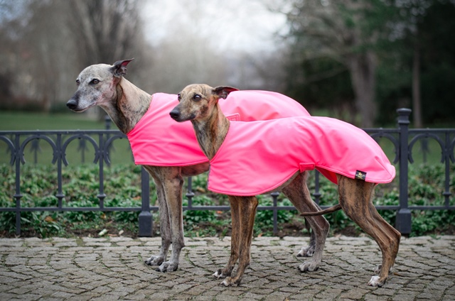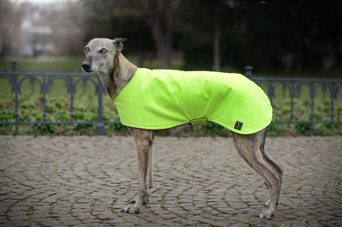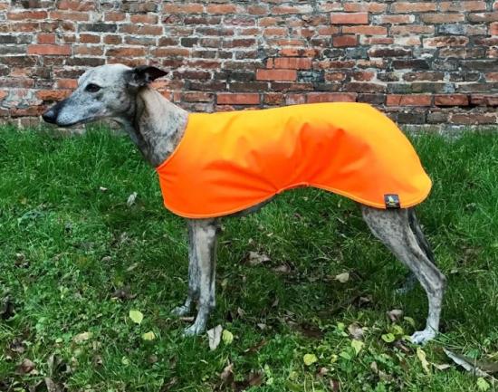 Nepromokavá hřejivá bunda ve sportovním provedení v neonové barvě pro snadnou viditelnost psa v nepříznivém počasí, členitém terénu či podzimním období, kdy je brzy tma. Bunda je z jedné strany ozdobena saténovou etiketou s chrtem a vpředu opatřena reflexním páskem. Bundička perfektně kryje celá záda a stehna psa a perfektně se přizpůsobí pohybu psa. Přední část bundy je upravena k co největšímu pohybu psa (běhání, skákání) a zapínání na břišní části upraveno tak, aby nebylo znečištěno při vykonávání potřeby (ocení zejména majitelé psů).