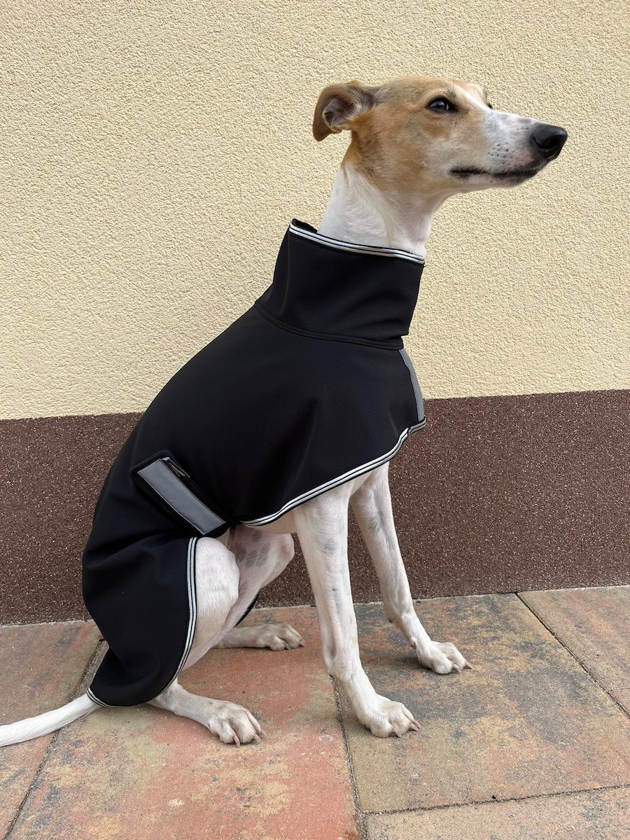 Nepromokavá hřejivá bunda v elegantním sportovním provedení. Bunda je z jedné strany ozdobena saténovou etiketou s chrtem. Zapínání je na suchý zip. Bunda má anatomické tvarování ve hřbetní a ocasní části, proto se perfektně přizpůsobí pohybu psa, aniž by se nadzvedávala zadní část bundy. Přední část bundy je upravena k co největšímu pohybu psa (běhání, skákání) a zapínání na břišní části upraveno tak, aby nebylo znečištěno při vykonávání potřeby (ocení zejména majitelé psů). Obleček je doplněn elegantním stojáčkem, který kryje krk.