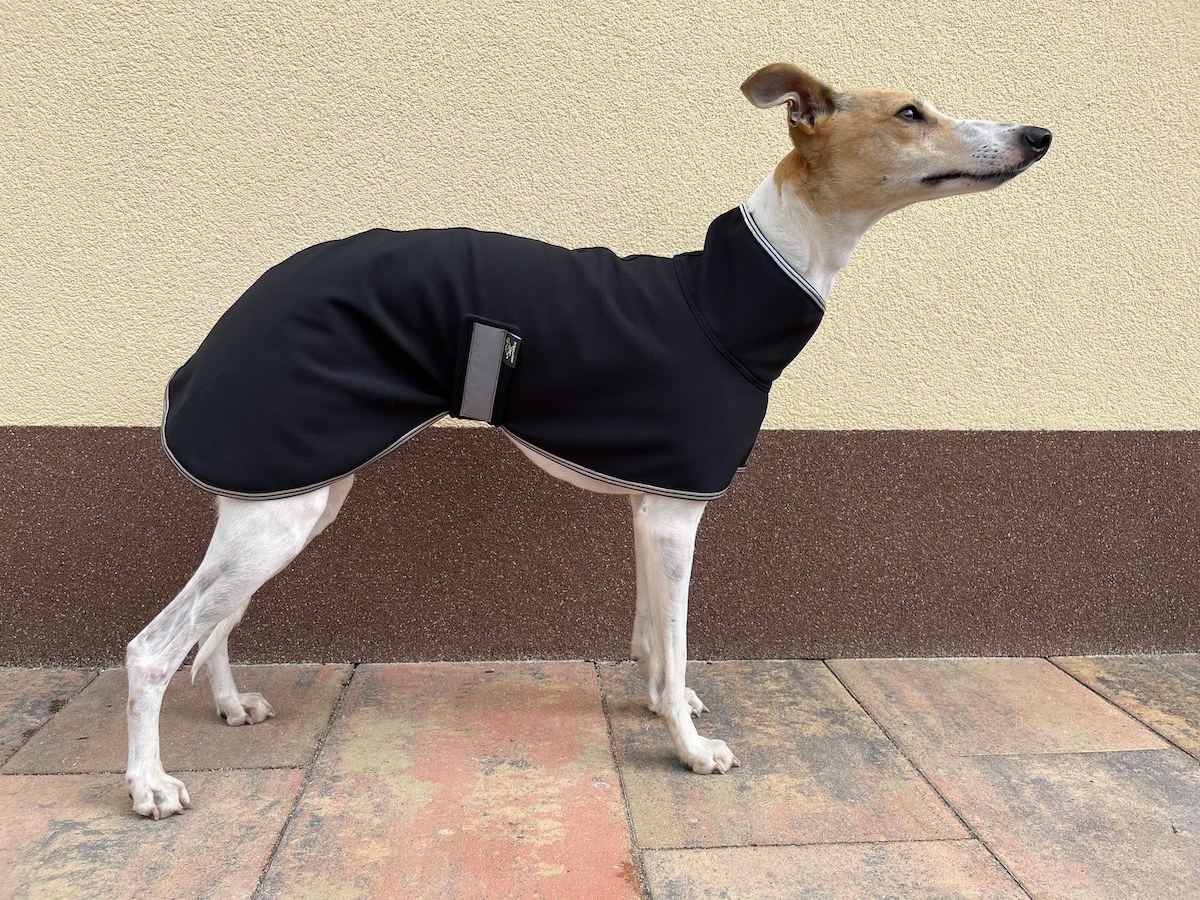 Nepromokavá hřejivá bunda v elegantním sportovním provedení. Bunda je z jedné strany ozdobena saténovou etiketou s chrtem. Zapínání je na suchý zip. Bunda má anatomické tvarování ve hřbetní a ocasní části, proto se perfektně přizpůsobí pohybu psa, aniž by se nadzvedávala zadní část bundy. Přední část bundy je upravena k co největšímu pohybu psa (běhání, skákání) a zapínání na břišní části upraveno tak, aby nebylo znečištěno při vykonávání potřeby (ocení zejména majitelé psů). Obleček je doplněn elegantním stojáčkem, který kryje krk.