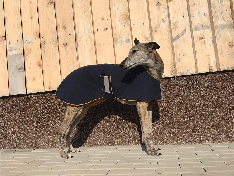 Nepromokavý hřejivý kabátek ve sportovním provedení vhodný do chladného počasí. Bunda je z jedné strany ozdobena saténovou etiketou s chrtem, v předu a na bočním zapínáním opatřena reflexním páskem. Bundička perfektně kryje celá záda a stehna psa a perfektně se přizpůsobí pohybu psa. Přední část bundy je upravena k co největšímu pohybu psa (běhání, skákání) a zapínání na břišní části upraveno tak, aby nebylo znečištěno při vykonávání potřeby (ocení zejména majitelé psů).