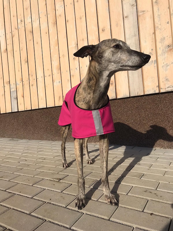 Nepromokavý hřejivý kabátek ve sportovním provedení vhodný do chladného počasí. Bunda je z jedné strany ozdobena saténovou etiketou s chrtem, v předu a na bočním zapínáním opatřena reflexním páskem. Bundička perfektně kryje celá záda a stehna psa a perfektně se přizpůsobí pohybu psa. Přední část bundy je upravena k co největšímu pohybu psa (běhání, skákání) a zapínání na břišní části upraveno tak, aby nebylo znečištěno při vykonávání potřeby (ocení zejména majitelé psů).