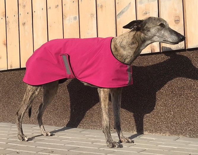 Nepromokavý hřejivý kabátek ve sportovním provedení vhodný do chladného počasí. Bunda je z jedné strany ozdobena saténovou etiketou s chrtem, v předu a na bočním zapínáním opatřena reflexním páskem. Bundička perfektně kryje celá záda a stehna psa a perfektně se přizpůsobí pohybu psa. Přední část bundy je upravena k co největšímu pohybu psa (běhání, skákání) a zapínání na břišní části upraveno tak, aby nebylo znečištěno při vykonávání potřeby (ocení zejména majitelé psů).