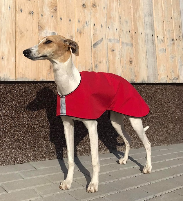 Nepromokavý hřejivý kabátek ve sportovním provedení vhodný do chladného počasí. Bunda je z jedné strany ozdobena saténovou etiketou s chrtem, v předu a na bočním zapínáním opatřena reflexním páskem. Bundička perfektně kryje celá záda a stehna psa a perfektně se přizpůsobí pohybu psa. Přední část bundy je upravena k co největšímu pohybu psa (běhání, skákání) a zapínání na břišní části upraveno tak, aby nebylo znečištěno při vykonávání potřeby (ocení zejména majitelé psů).