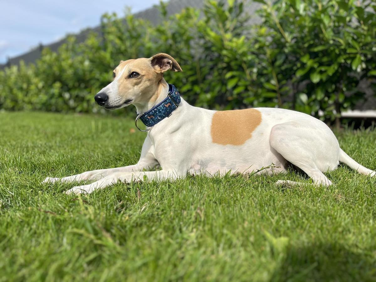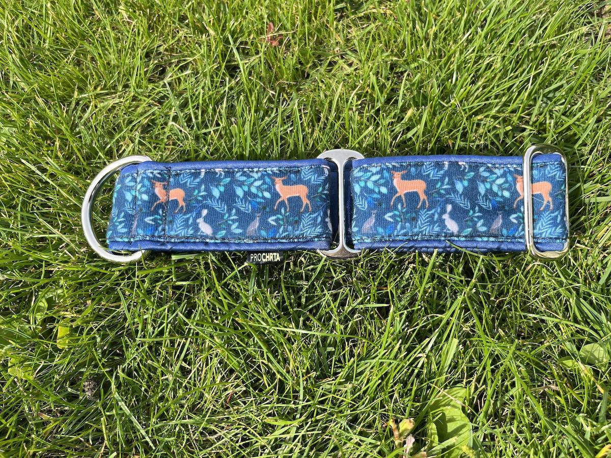 Elegantní softshellový obojek s motivem barevného lesa se stříbrným kováním, který ozdobí každý jemný psí krček.